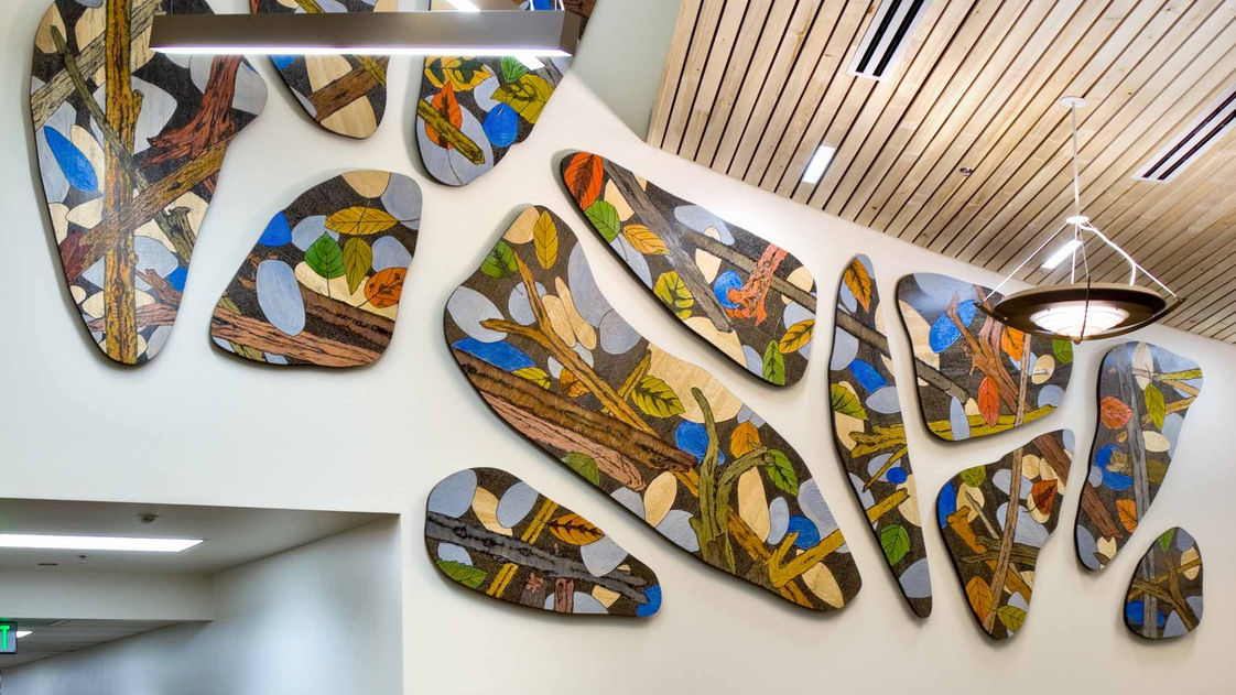 Waterline is a series of 13 relief-carved and painted basswood panels for the school’s main lobby. Panel fabrication and installation by Brandon McGrath-Bernhard. Commissioned by the Municipality of Anchorage Percent for Art program. Photos by Glenn Aronwits.